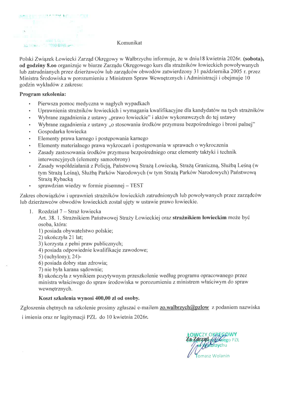 Kurs dla strażników łowieckich w dniu 18 kwietnia 2026 r.