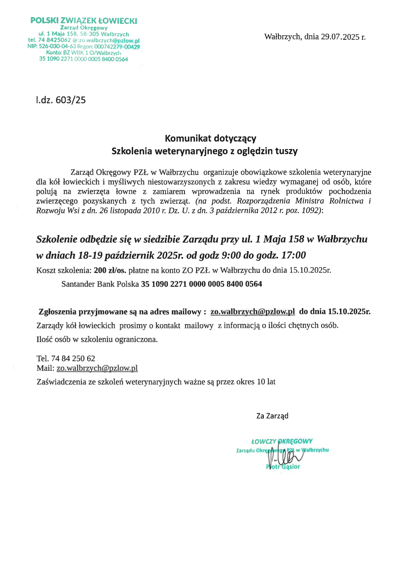 Szkolenie weterynaryjne w dniach 18-19 październik 2025 r.- komunikat